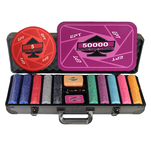 ชิปโป๊กเกอร์เซรามิกคุณภาพสูง ขนาด 39 มม. ระดับคาสิโน แบบกำหนดเอง สำหรับเกม EPT WPT Texas Hold'em พร้อมแผ่น EPT และชุดชิปโป๊กเกอร์